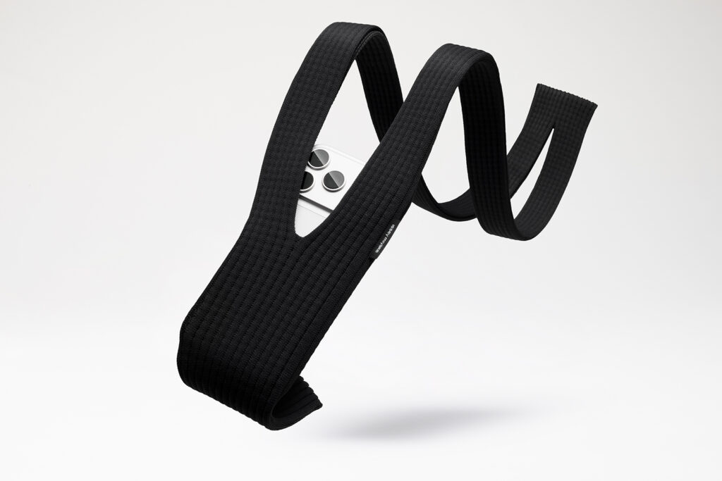 「一枚の布」のコンセプトからインスピレーションを得たオリジナルの3D ニット構造の「iPhone Pocket」。イッセイ ミヤケによるオリジナルのプリーツ素材に着想を得たリブ編みのオープン構造が特徴だ。アウトフィットにもう1つポケットを加えるというアイデアから生まれたその飾らないデザインは、iPhone を完全に包み込み、さらに他のアイテムが入るように伸縮して広がる。編み地の開いた部分からiPhone のディスプレイが見えるつくりに。