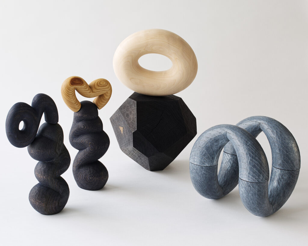 素材にはウォールナットやメープル、チェリーなどの広葉樹が用いられ、木が本来持つ色や木目、質感を活かしながら1点1点手作業で削り出される。削りの痕跡を残す有機的なフォルムと、磁力によって成立する構造が組み合わさることで、静かなバランスの上に成り立つ造形が立ち上がる。