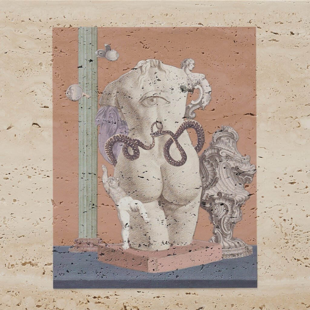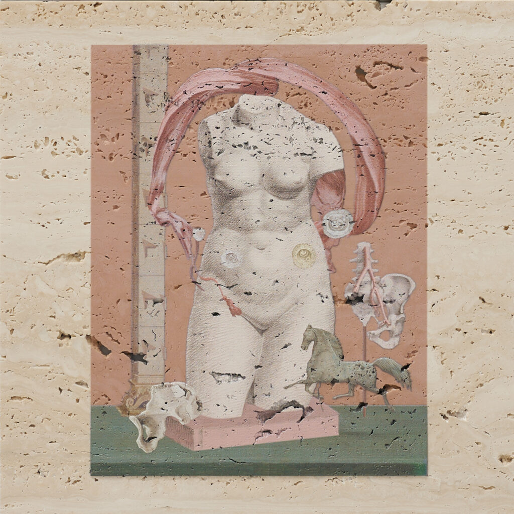 「名画の中の人体はどうなっているのだろう?」という解剖学的な好奇心のもと、内臓や骨をモチーフに描かれるモンタージュは、古典芸術への敬意を前提としながら、「芸術のための芸術」と誠実に向き合う試みを続ける。