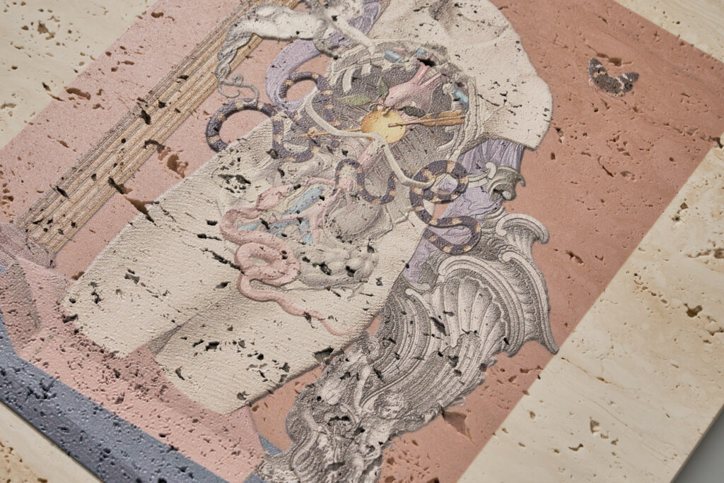 ギリシャ神話の「三美神」(カリス)をアイコンに、重厚な大理石へプリントを試みた新作「She,Still Life Ⅰ,II,Ⅲ」をはじめ、「心臓」を一つの建物のように構造分解し、木材にプリントした「Serene Operation Ⅰ,Ⅱ」など、一見無機質に見える質感の中にも、温もりが息づく作品群を紹介。