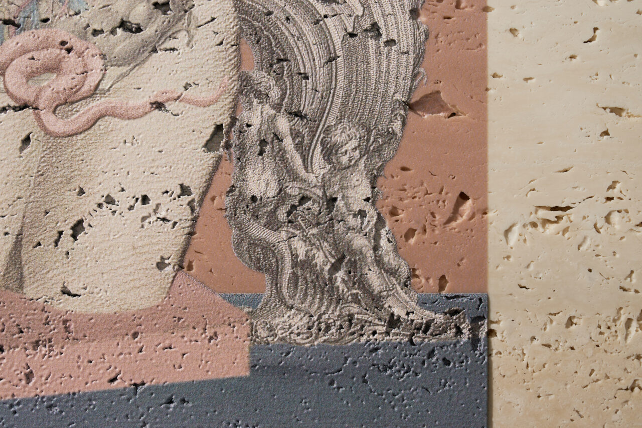 ギリシャ神話の「三美神」(カリス)をアイコンに、重厚な大理石へプリントを試みた新作「She,Still Life Ⅰ,II,Ⅲ」をはじめ、「心臓」を一つの建物のように構造分解し、木材にプリントした「Serene Operation Ⅰ,Ⅱ」など、一見無機質に見える質感の中にも、温もりが息づく作品群を紹介。