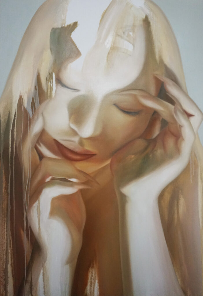 山中は、身体の輪郭とその内側に潜む非人間的な気配を捉えるように、具象と抽象の境界を往還する。光を遮る影や画面に浮かぶ空白、液体のように流れる形象によって、「私」が何か別の存在へと変容していく過程を示唆。セルフィ的ポーズや表情の引用は、SNS時代における自己像の揺らぎ──見せるための姿が内面を侵食していく現代的な不安──を鋭く可視化している。