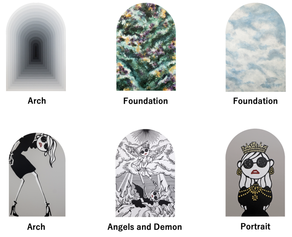 アーチ形キャンバスに描かれた新作、複数のアーチをレイヤードした代表作「Arch」など、約150点におよぶ作品を展示・販売する。