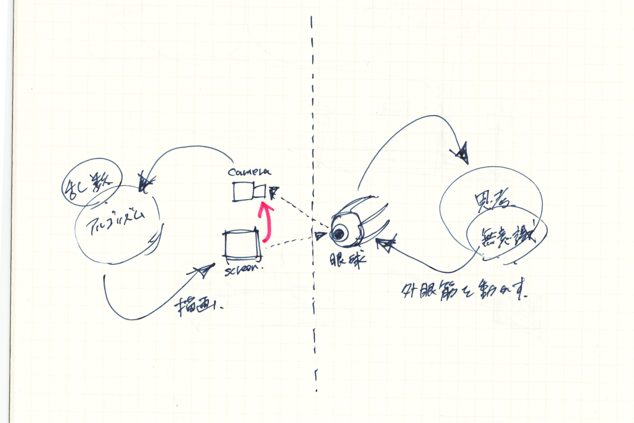 ビデオ・フィードバックの間にコンピュータを挟むことで、機械自身が「視ること自体を視る」、つまり体験者のいない自走する《Eye-Tracking Informatics (ETI)》(三上晴子、2011)のような状態を提示する。平川がプログラミングを担当した三上晴子の《ETI》、そして2003年に平川が多摩美大生の時、「メディア芸術研究室ワークショップ「空間-身体:プロセスとループ」(NTTインターコミュニケーション・センター[ICC])で展示したグループワークを念頭においた習作。
