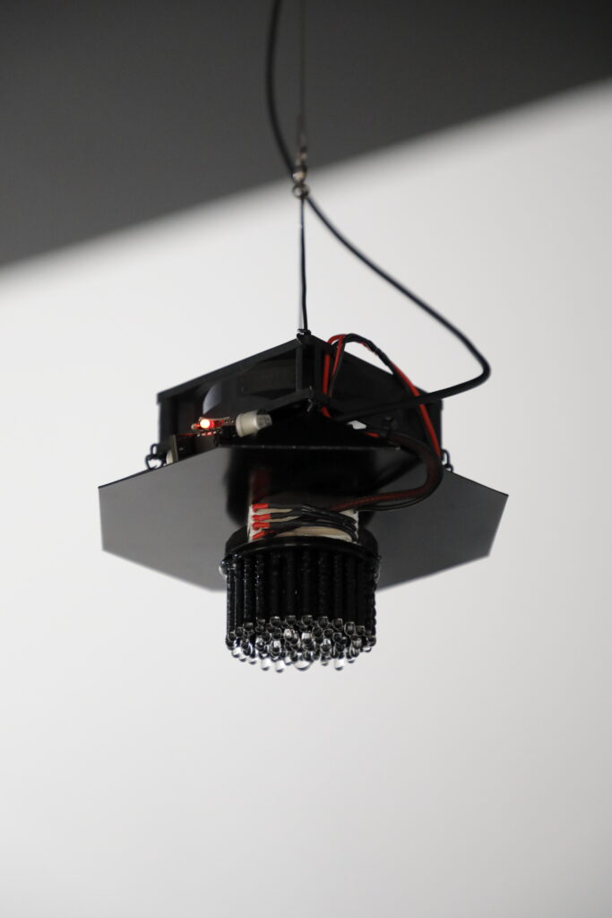 会場の空間内にある水の循環を可視化する作品。空気中の湿度を凝縮し、結露として顕在化させてゆく。水の存在は生命の兆候であり、生命を扱ったアートの実践の中でも、三上晴子が行った免疫やウイルスというテーマの先駆性が意識されている。