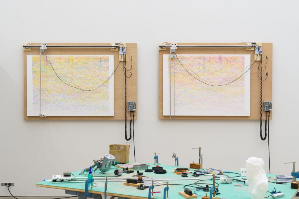 菅野創との共作によるドローイング・マシンによるシリーズ「SDM (SENSELESS DRAWING MODULES)」(2011)を経て、個人名で発表された《(con)sequences #1》(2023)の改良版。色ペンを付けたXYプロッターが、人の存在や音に応じて稼動することで、環境がドローイングを続けていく。三上の遺作《欲望のコード》(2010)での複数のモジュールが蠢くシステムとの親和性をもつ。三上はSDMを評価していたという。