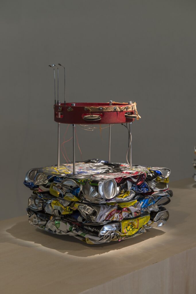空き缶をキューブ上に圧縮した土台にタンバリンが屹立する本作は、人類を通して都市自体が見た夢をマイニングする彫刻である。三上晴子が亡くなった年に毛利が発表した本作は、1980年代に三上が鉄やケーブルなどのジャンクを素材にインスタレーションを展開したことにも重ねて見ることができる。