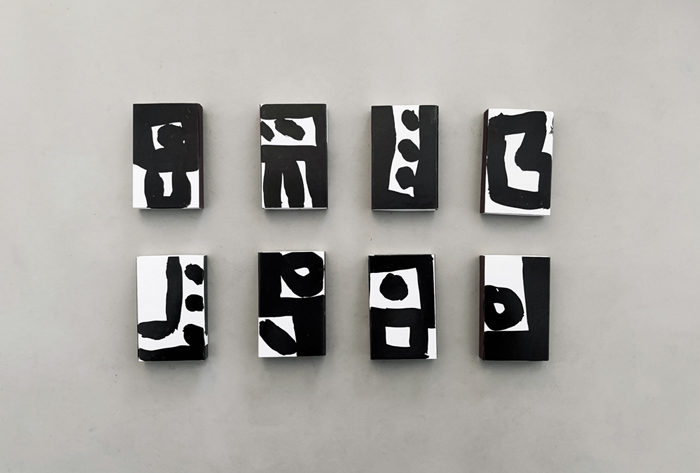 本展では、黒点模様が象徴的な新作の「Pecas」シリーズを中心に、額装作品から手のひらサイズの作品まで、大小さまざまな支持体に描いた抽象作品を展示。