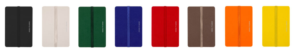 手のひらに収まるコンパクトで洗練されたサイズで持ち運びに最適。8色展開、表紙にはISSEY MIYAKEロゴをシルバー箔で、背面にはMOLESKINEロゴを型押しであしらい、表紙中央に刻まれた一本の型押しの線に沿って走るゴムバンドがミニマルな存在感を添える。