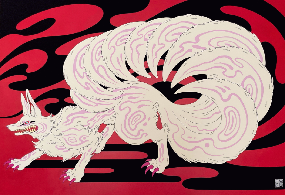 日本画や浮世絵に影響を受けた日本的なモチーフを、緻密な構図、流れるような描線、艶やかな色彩で表現し、怪奇とポップが共存する独自の幽玄な世界を築き上げる。