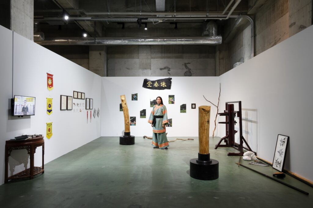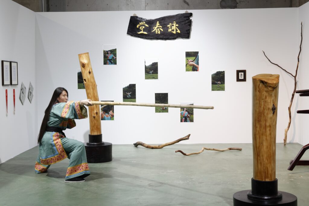 展示スペースを「詠春堂」という道場に見立て、人の形を模した「木人」と呼ばれる立体物が数体配置されている。作品の中には彫刻として作り上げた棍(こん)と呼ばれる長い棒状のの武器なども。アート作品でありながらも、実際の稽古で彼が使用している道具でもある。展示スペースを「詠春堂」という道場に見立て、人の形を模した「木人」と呼ばれる立体物が数体配置されている。作品の中には彫刻として作り上げた棍(こん)と呼ばれる長い棒状のの武器なども。アート作品でありながらも、実際の稽古で彼が使用している道具でもある。