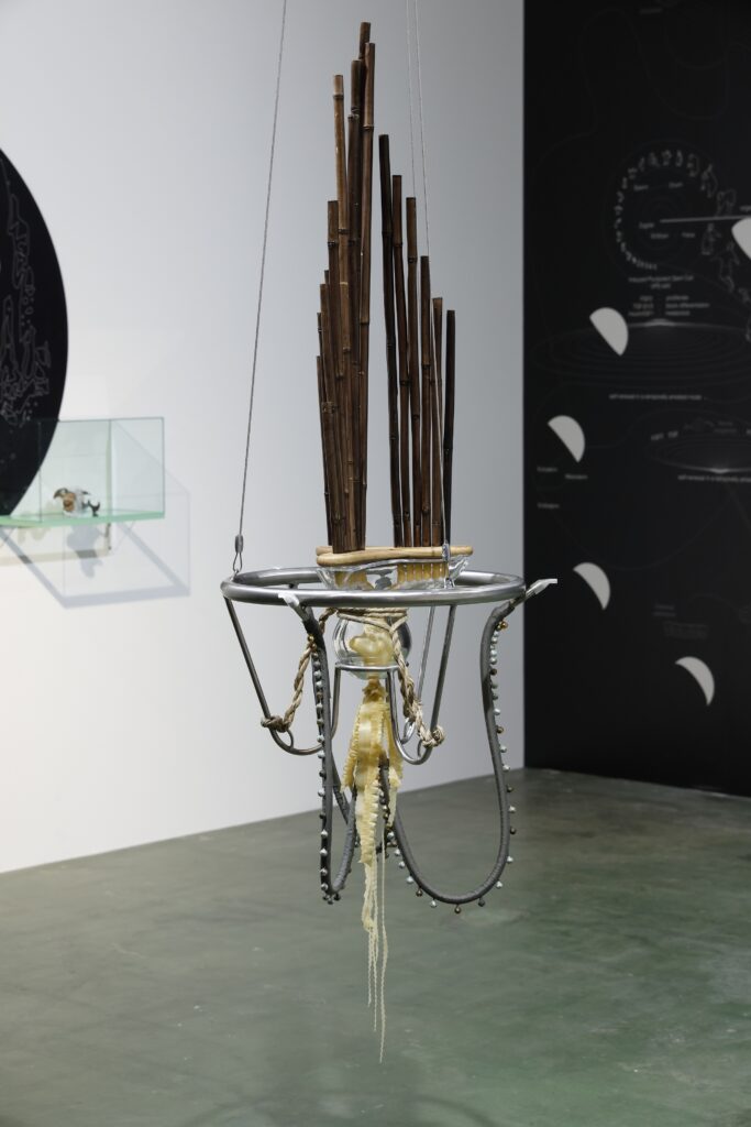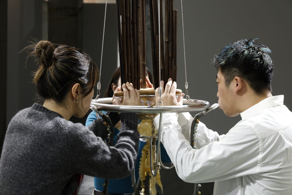 楽器でもあり彫刻でもあるオブジェが、スペースの中央にぶら下がる。雅楽器の笙のようなものが上部に配置され3方向に吹口があり実際に演奏することができるインタラクティブ作品にもなっている。