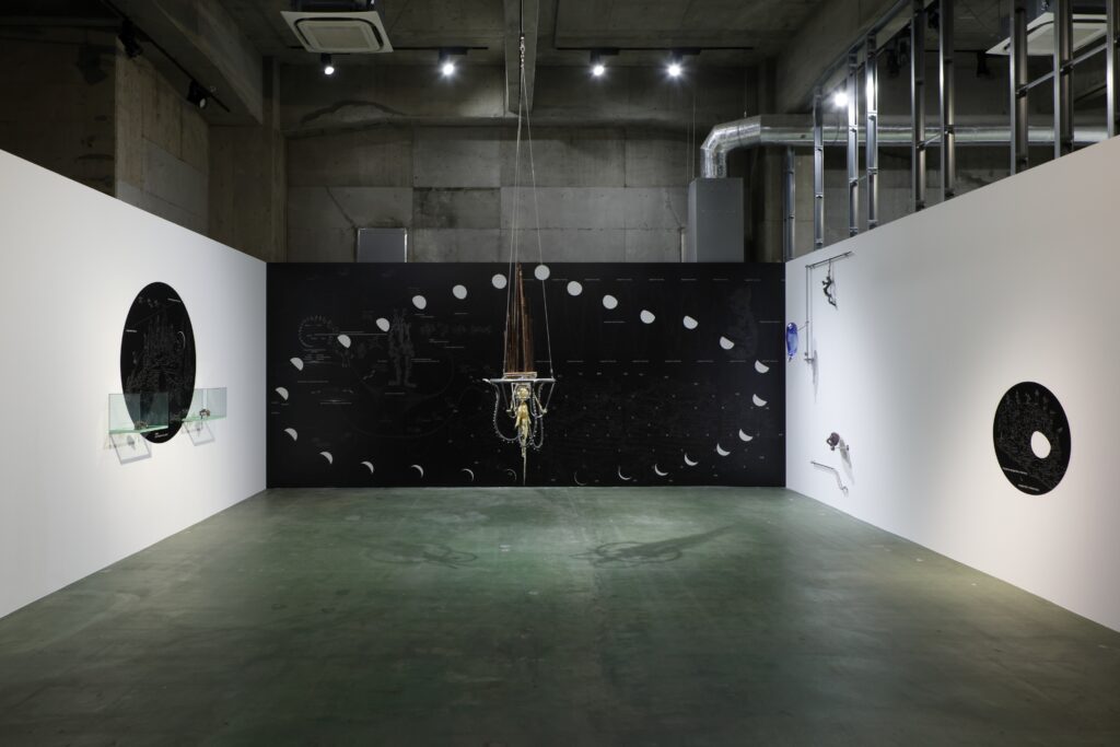 iPS 細胞に着想を得て身体の表象をガラスやブロンズで構成した作品、壁一面に月の満ち欠けと生命や身体の機能などをリンクさせた絵、複数作品でその世界観を作り上げている。