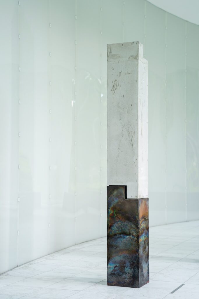 空間全体をインスタレーションとして捉え、構造的なアプローチの中に素材の自然な表情を巧みに活かす橋本。