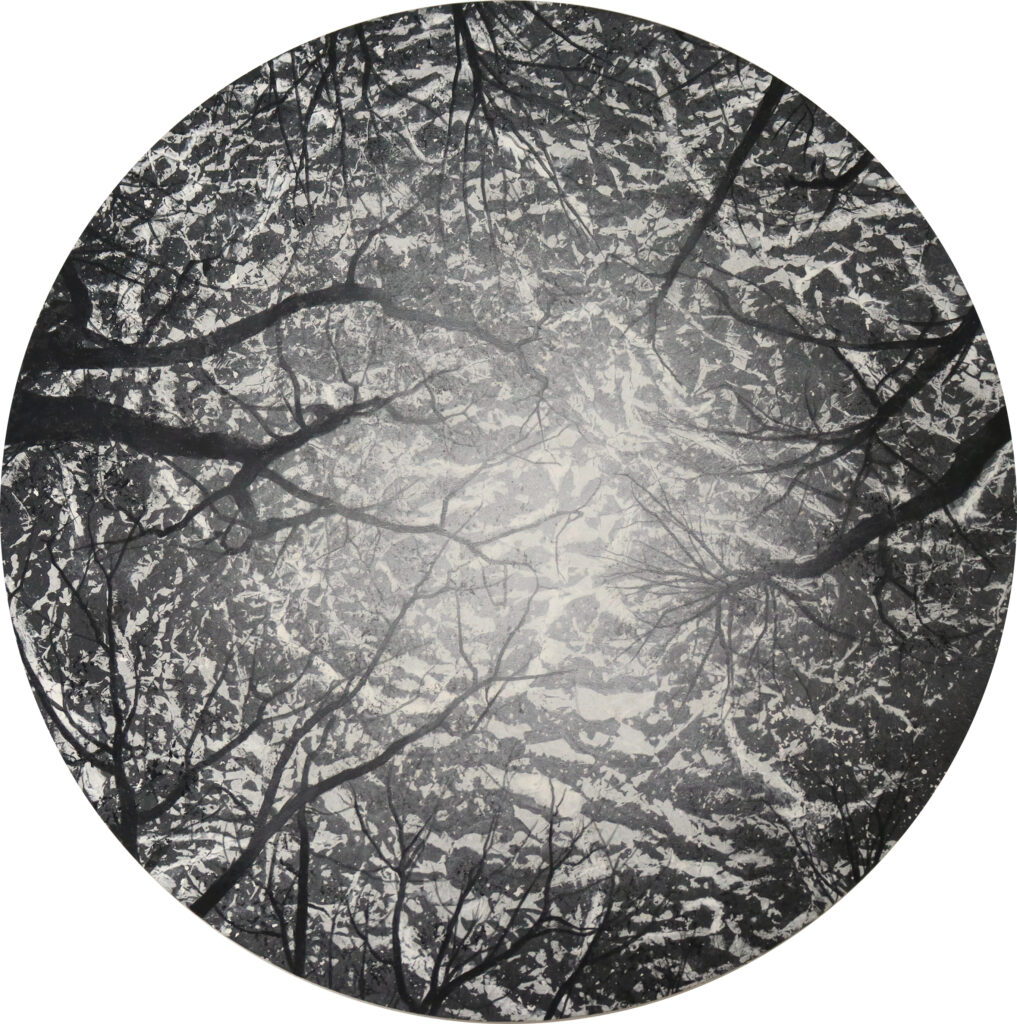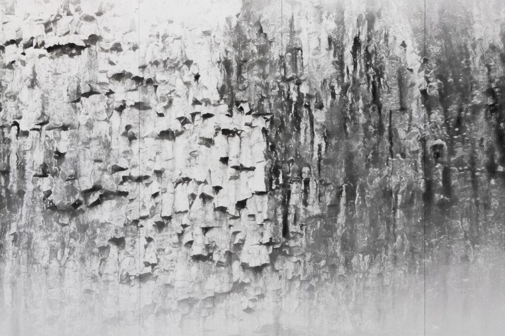 彼の制作は、和紙に何層にもわたり墨を重ね、その上から膠で溶いた胡粉を幾度も薄く塗り重ねることから始まる。まるで虚空の闇から光が立ち上がるようなプロセスだ。さらに、揉み紙によって生じる皺の表情を、あるときは抽象的な宙として、またあるときは洞窟壁画の表面を辿るようなテクスチュアとして捉える。そこには予定調和を超えた荒涼たる雪山や絶壁、雲や霞に包まれた無人の風景が現れ、膨大な死と生の流転を孕んだ「不在」の中の「在」を感じ取ることを示唆している。