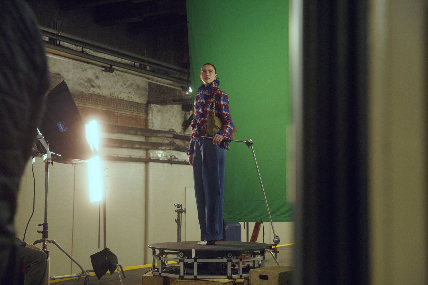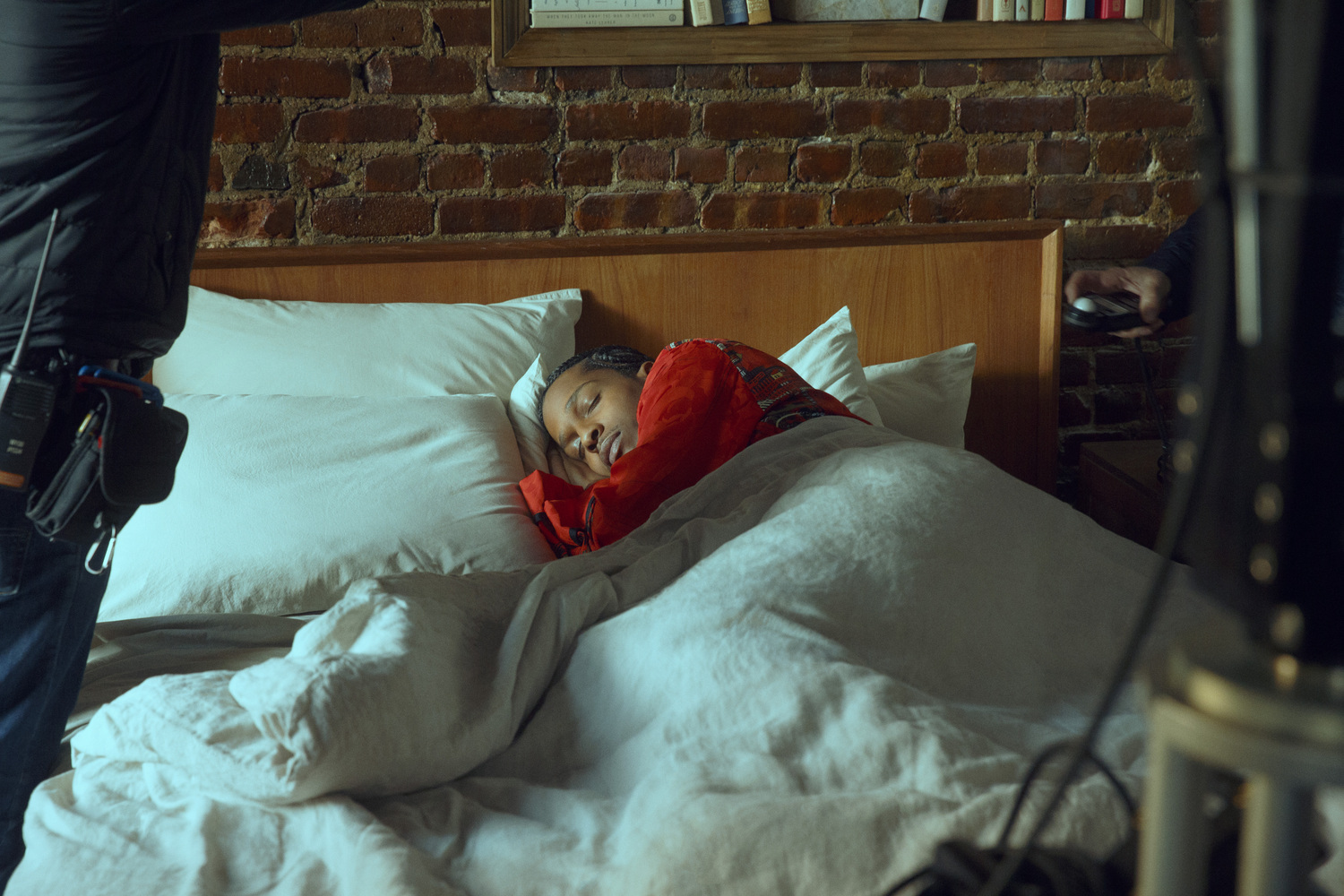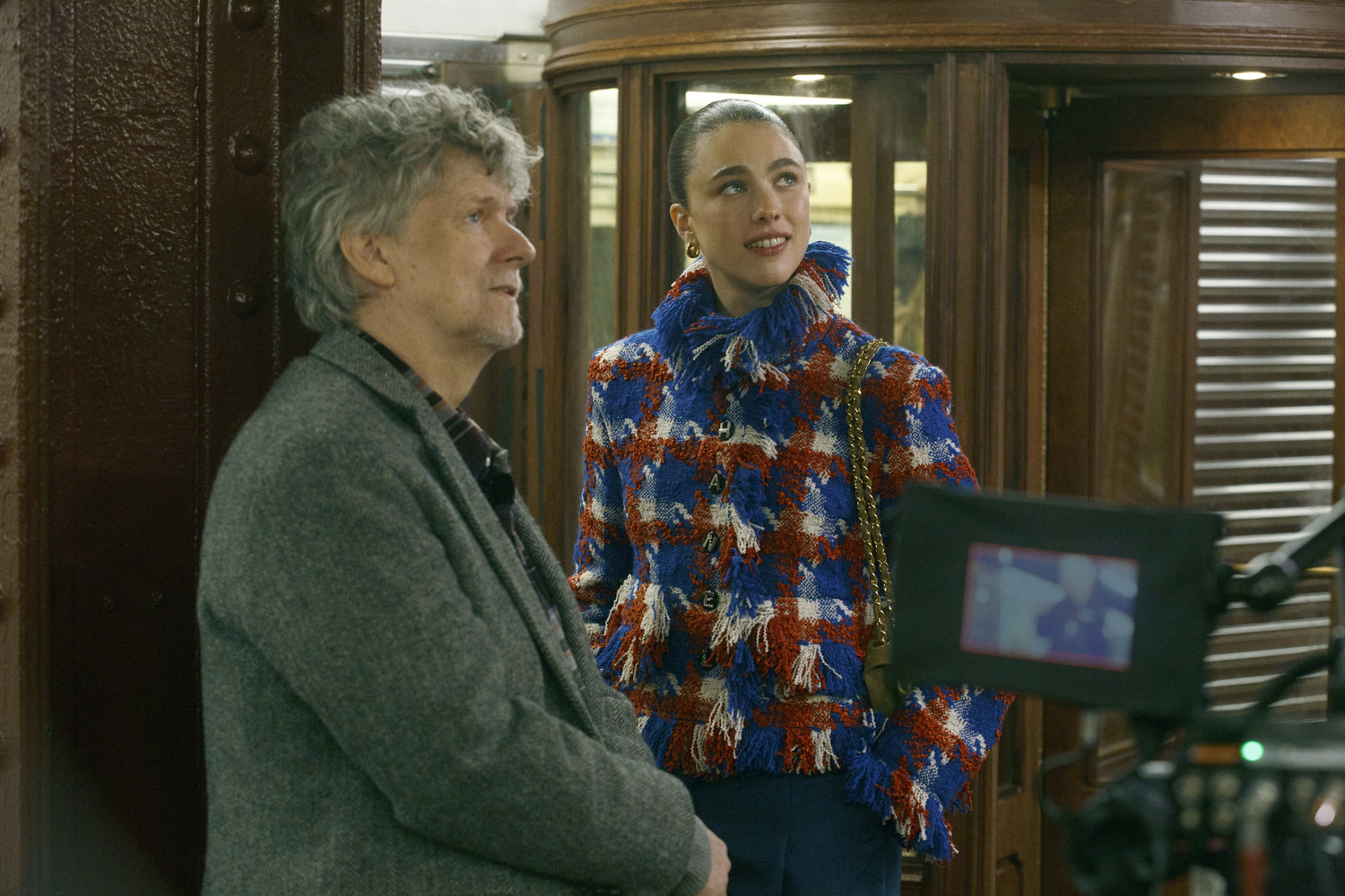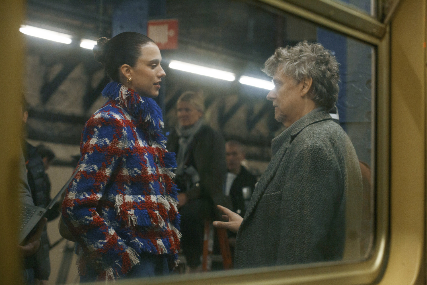 フィルム内でエイサップは2025-26年メティエダール コレクションより、シルクパジャマとダービーシューズを着用。マーガレットは2025-26年 メティエダール コレクションより、テクスチャードツイードのジャケット、ウールパンツ、ハイヒールのメリージェーン、バッグを着用している。