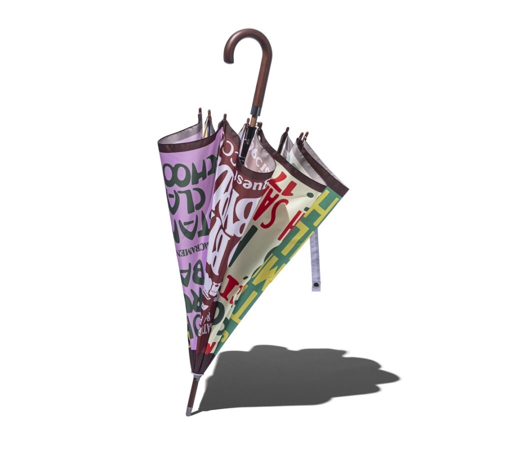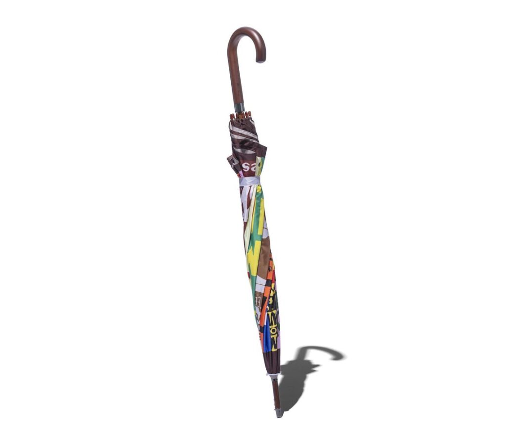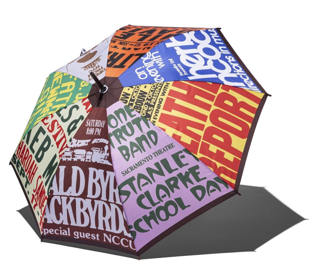 三角形の「こま」の部分に、色とりどりのコンサートポスターのデザインを配したインパクトあふれる傘。開いたときの姿は、まるでひとつの大きなコラージュのよう。タイムマシンのように1960年代〜1970年代の夢のジャズフェスへと誘いながら、この時代の音楽とレジェンドたちにオマージュを捧げている。