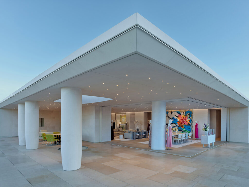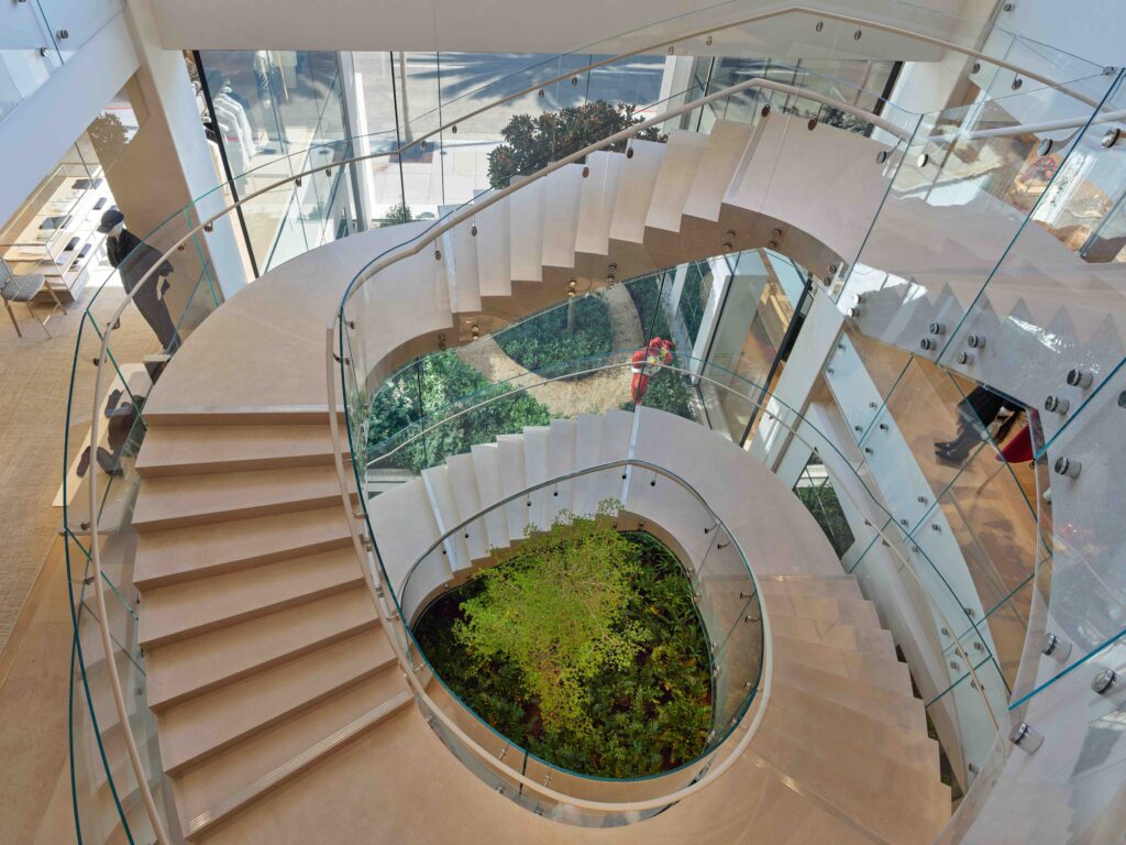 うねる石灰岩とスタッコのファサードの奥には、無駄を削ぎ落としながらも洗練された雰囲気が漂い、中央には、ピーター・マリノが構想し、ランドスケープアーキテクトのピーター・ワーツが手掛けた緑豊かな3階建ての庭園を貫く壮大な階段が続いていく。 光に包まれ、メゾンのコードが繊細に散りばめられた店内は、伝統と創造性が融合した錬金術的な出会いを映し出す空間。ウィメンズ、メンズのプレタポルテからレザーグッズ、ジュエリー、ディオール メゾン、フレグランスまで、幅広いコレクションが展示されている。これらの世界観をさらに豊かに彩る、この特別なブティックのために特別に制作された限定アイテムの数々。訪れる人々に安らぎを与える植物の要素が、様々な空間を彩り、植物の有機的な存在感がブティック内を彩る。