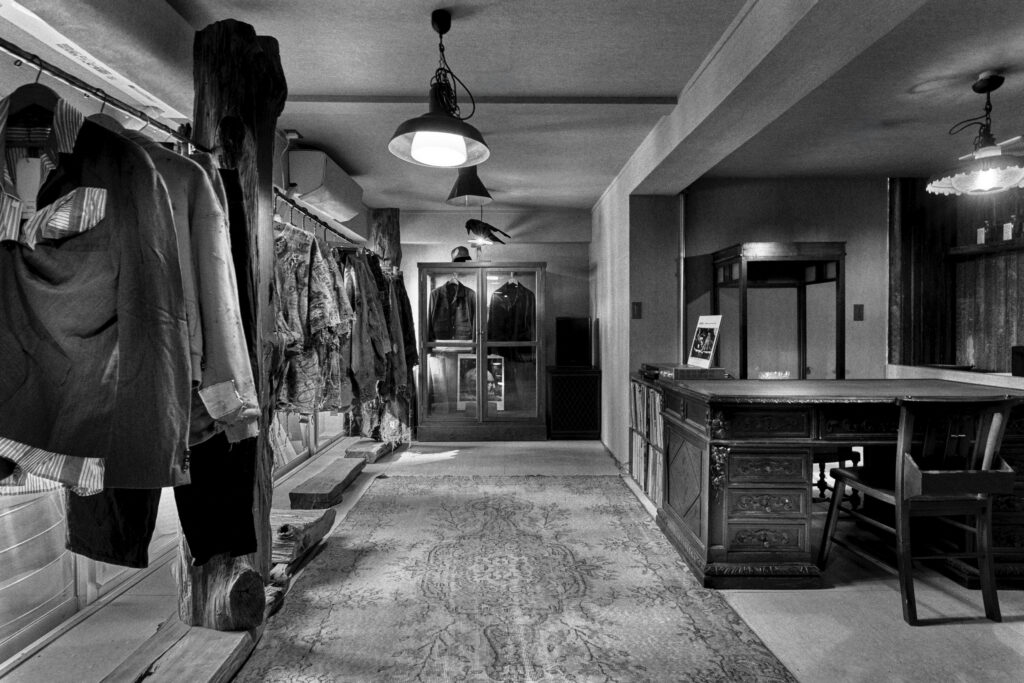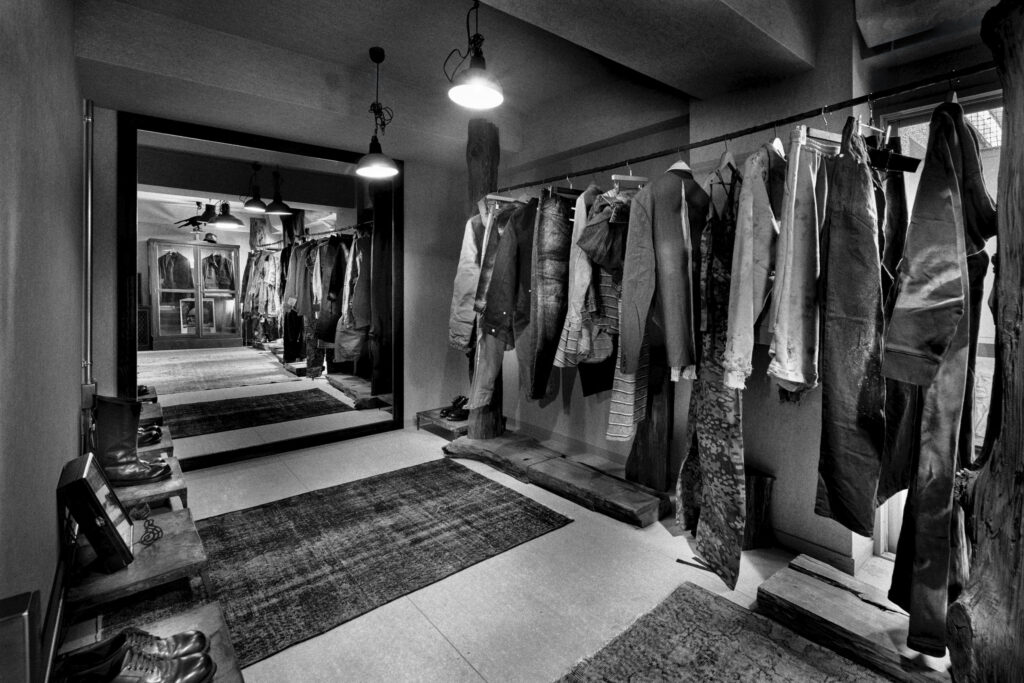 内装には、職人と製作した神代杉のラック、鍛冶屋に鉄を一から打ってもらい共同制作した手打ちのハンガーや鉄筋の物干し竿、西洋、東洋のデザイナーが集めたアンティーク品、古道具で構成されている。