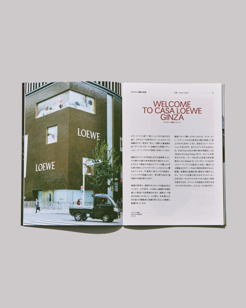配布される、精彩にプリントされた銀座のシティガイドは、「LOEWE」のエッセンスと響き合う重要な店舗や事業者を紹介。このガイドではカサロエベ銀座を建築的・美的観点から掘り下げているほか、