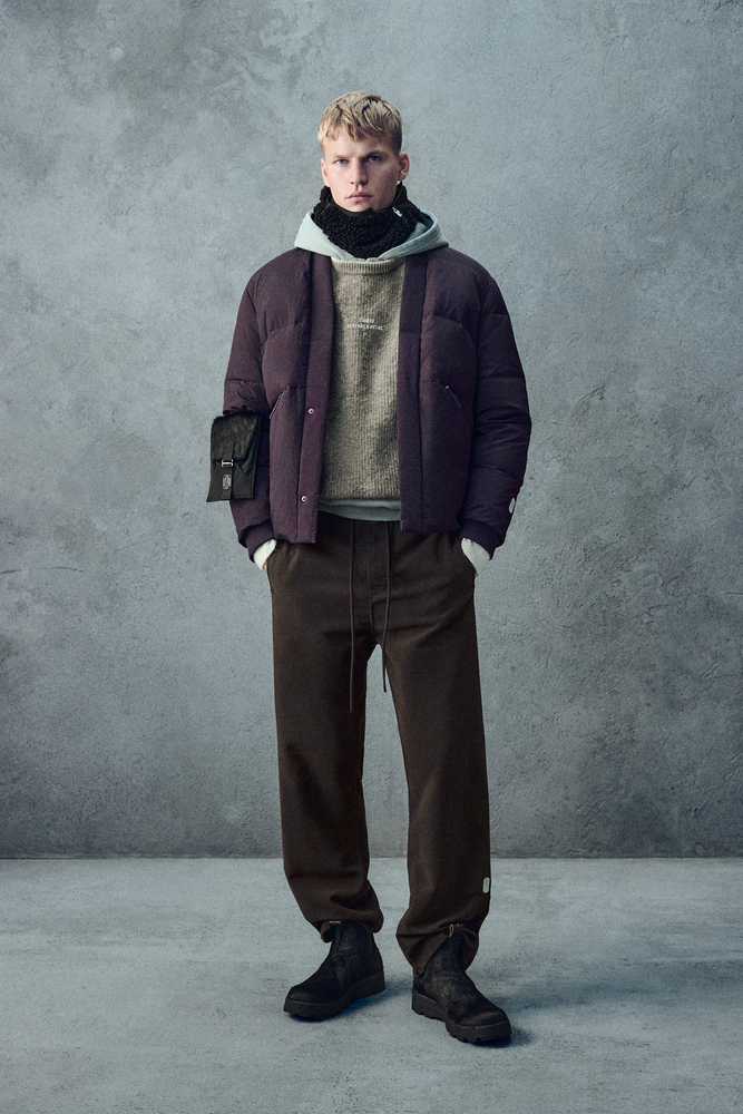 そのデザインは、素材が起点。フェルト加工のコットン、イタリア製ナイロン、ボイルドウール、特殊仕上げによるデニム、国産のベジタブルタンニンレザー、そしてフェイクディアスキンなど、さまざまな素材が単体または組み合わせで用いられている。表面には、素材本来の質感と重量感を際立たせるための加工が施されている。カラーパレット、スレートブルー、チョーククレイ、ボルカニックグレー、アンバー、ブラックマホガニーといった落ち着いたトーンを基調に、コントラストを生む箇所にエレクトリックバイオレットやオリーブを精密に配している。
