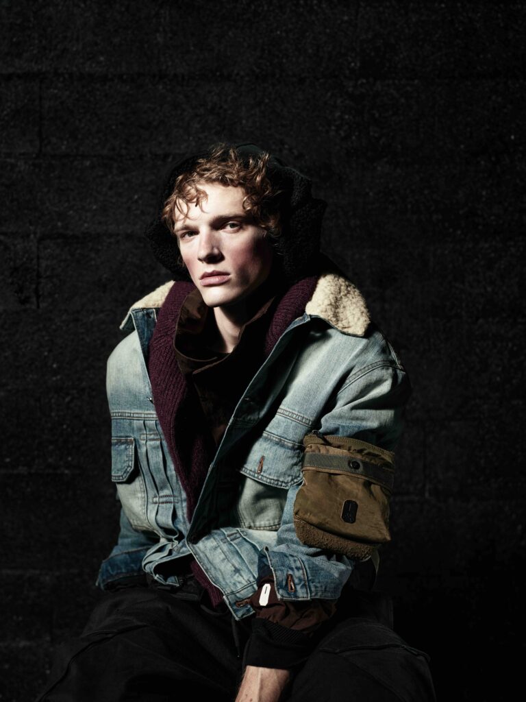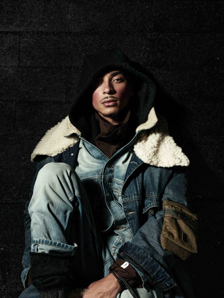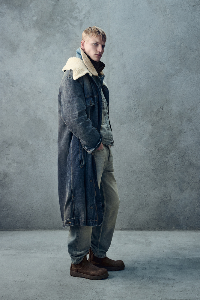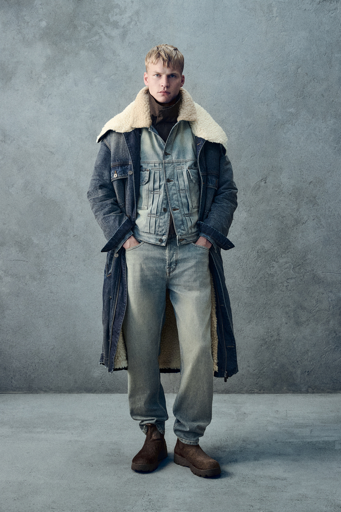 「SR_A」は、デニムに対しても既成概念にとらわれないアプローチを用いている。シェルパ素材のロングジャケットは、計算されたウォッシュ加工と斜めのディテールが特徴。ドライな質感に仕上げたウォッシュドのストレートレッグジーンズと組み合わせている。