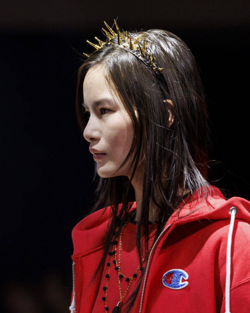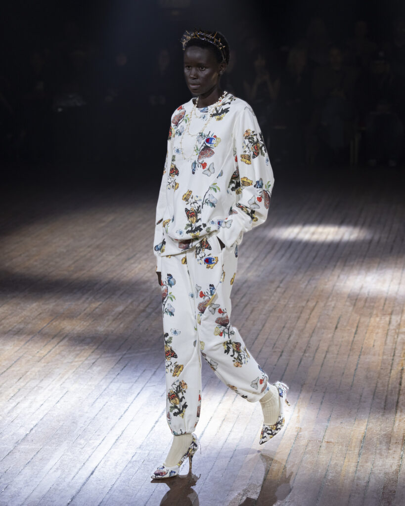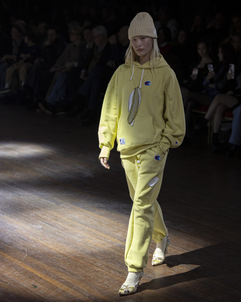 パリで行われたUNDERCOVER 2025年秋冬ウィメンズコレクションのショーに登場した、パーカやスウェットパンツなどのアイテムは、前回のコラボレーションと同じくChampionを象徴する「リバースウィーブ」で、生地の厚みを10ozから11.5ozにアップデートされている。
